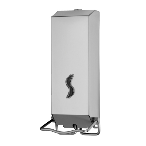 Distributore con serbatoio in plastica a riempimento da 1,2 lt per tutti i tipi di sapone liquido, salvo quelli con microgranuli; sistema di erogazione con leva azionabile a gomito; finestra per il controllo del livello del sapone; serratura antivandalo in metallo; kit d'installazione incluso (viteria in inox e tasselli).