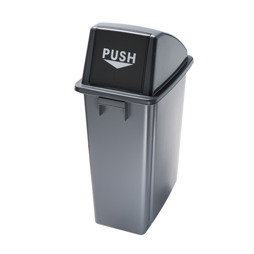 Coperchio con sportello push; maniglie integrate laterali per agevolarne lo spostamento; design compatto per un facile collocamento; facile pulizia e manutenzione; soluzione ideale per uffici e per il settore della ristorazione collettiva.