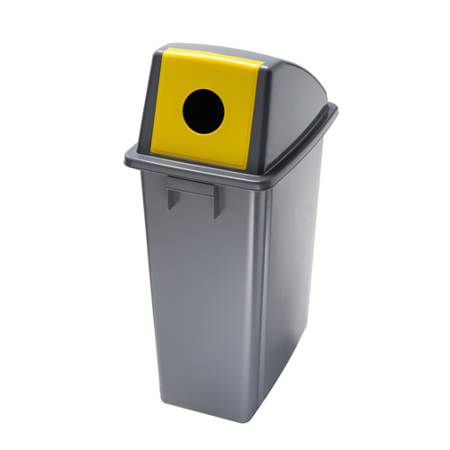 Coperchio con apertura frontale giallo; maniglie integrate laterali per agevolarne lo spostamento; design compatto per un facile collocamento; facile pulizia e manutenzione; soluzione ideale per uffici e per il settore della ristorazione collettiva.