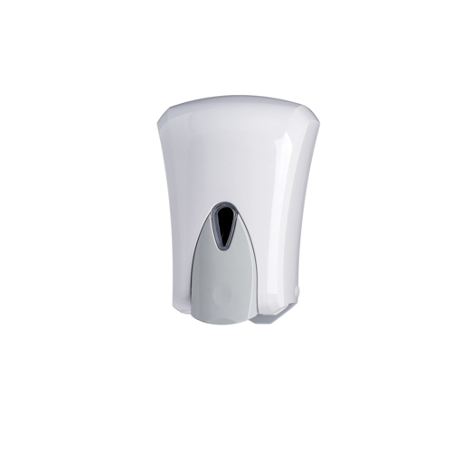 Distributore con serbatoio in plastica a riempimento da 1 lt per tutti i tipi di sapone, salvo quelli a microgranuli; sistema di erogazione “push” anti-gocciolamento; finestra per il controllo del livello del sapone; serratura in plastica; kit d'installazione incluso (viteria e tasselli).