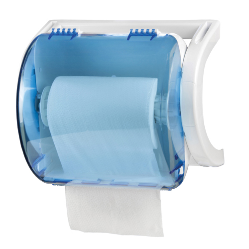 Base in ABS bianco e carenatura in ABS trasparente; dim. max rotolo: (Ø) 290 mm x (L) 290 mm; murale o d’appoggio; viteria inclusa.
