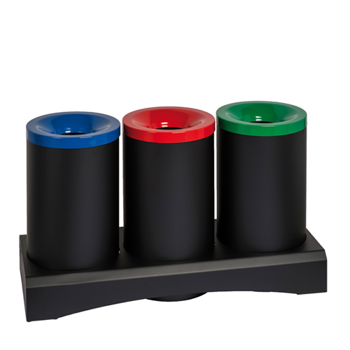Isola ecologica composta da tre gettacarte antifuoco; struttura in metallo verniciato con polveri epossidiche; coperchi colorati per la raccolta differenziata; coperchio auto-soffocante per bloccare la propagazione del fuoco.