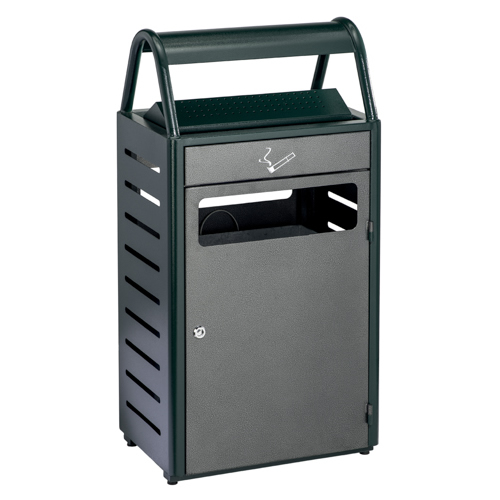 Struttura in acciaio trattato con cataforesi; verniciato con polvere epossidica per esterno; secchio interno in acciaio galvanizzato con maniglia (misure 380x280x440); posacenere e gettacarte bloccati dalla porta frontale; serratura con una chiave triangolare antivandalo; piedi d’appoggio in plastica; fissaggio al suolo in 2 punti (viteria inclusa).